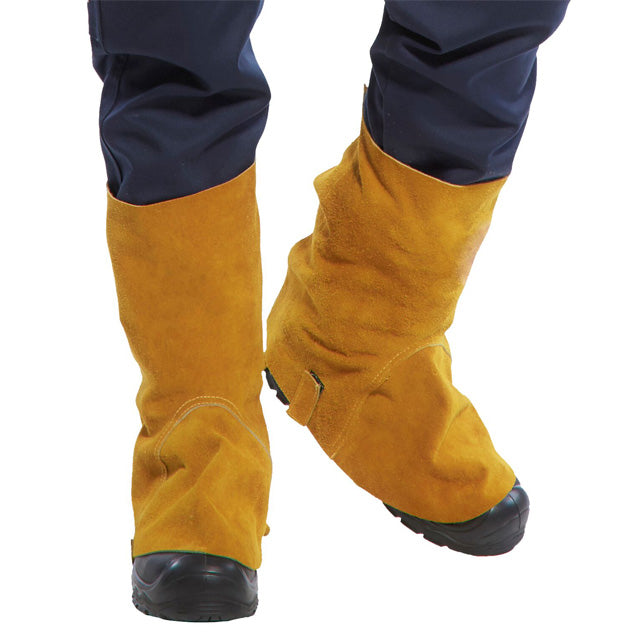 Premium quality boot covers made of split cowhide leather. The strong material protects the feet and lower legs when welding and is designed to last in the toughest environments.